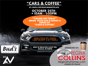 This "Cars & Coffee" in Eagle is Hosted at Buds Marketplace on the Corner of Beacon Light and I-16 by Regina Collins REALTOR® with Homes of Idaho. Please bring your Car, Truck, Sports Car, Classic Vehicle, and CANDY to do Trunk or Treat as well. We will have FREE COFFEE, DJ / Music, Swag, and offer food to purchase too! This is Kid and FAMILY friendly, so please dress up and bring your kids too!